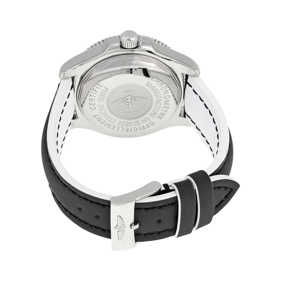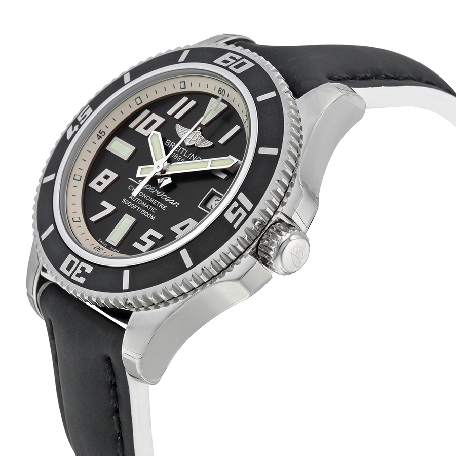 Stainless steel case with a black and white leather strap. Uni-directional rotating bezel. Black dial with luminous hands and Arabic numeral hour markers. Minute markers around the outer rim. Dial Type: Analog. Date display at the 3 o'clock position. Automatic movement. Scratch resistant sapphire crystal. Pull / push crown. Case diameter: 42 mm. Case thickness: 15 mm. Round case shape. Tang clasp. Water resistant at 1500 meters / 5000 feet. Functions: date, hour, minute, second. Luxury watch style. Watch label: Swiss Made. Breitling Superocean 42 Black Dial Automatic Mens Watch A1736402-BA29BKWHT.