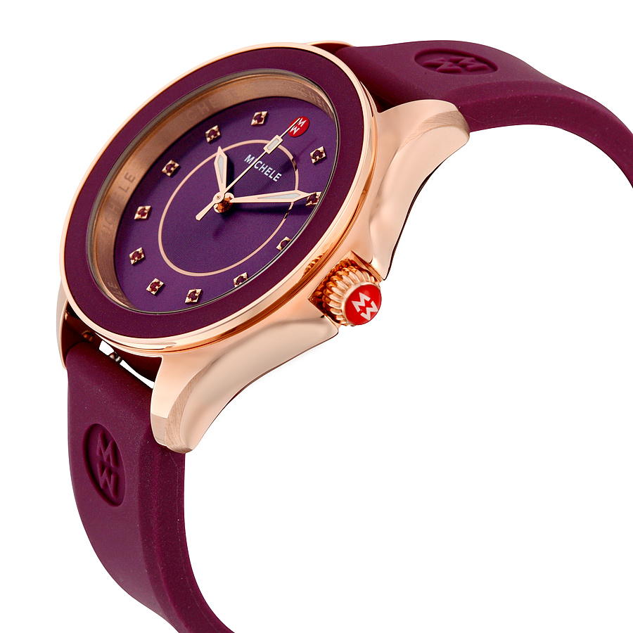 Rose gold-plated stainless steel case with a berry silicone strap. Fixed rose gold-plated bezel with berry silicone insert. Berry sunray dial with luminous rose gold-tone hands and blazing red topaz index hour markers. Dial Type: Analog. Luminescent hands. Quartz movement. Scratch resistant mineral crystal. Red cabochon crown. Solid case back. Case diameter: 40 mm. Case thickness: 11 mm. Round case shape. Band width: 18 mm. Tang clasp. Water resistant at 50 meters / 165 feet. Functions: hour, minute, second. Dress watch style. Michele Cape Berry Sunray Dial Berry Silicone Quartz Ladies Watch MWW27A000002.