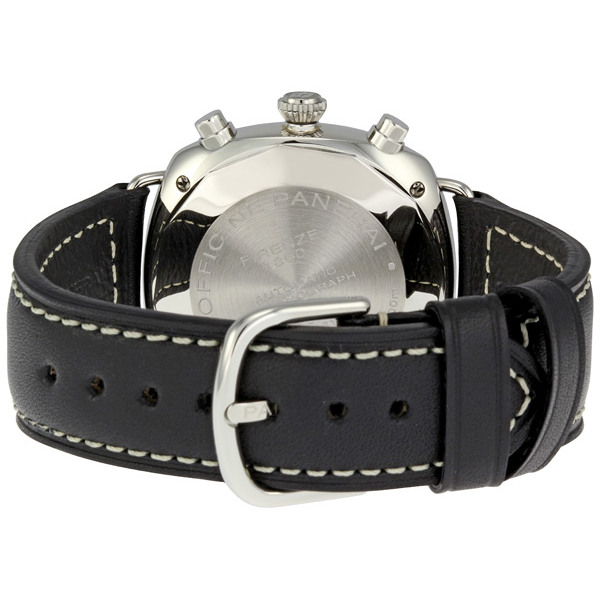 Stainless steel case with a black leather strap with contrast stiching. Fixed stainless steel bezel. Black dial with luminous black hands and stick hour markers. Arabic numerals mark the 6 and 12 o'clock positions. Minute markers around the outer rim. Chronograph - two sub-dials displaying: 60 seconds and 30 minutes. Self winding (automatic) C.O.S.C mechanical movement. Scratch resistant sapphire crystal. Crown-shaped fluted crown. Screw down solid case back. Case diameter: 42 mm. Tang clasp. Water resistant at 100 meters / 330 feet. Functions: hours, minutes, small seconds, chronograph. Panerai Radiomir Chronograph Men's Watch 00369.