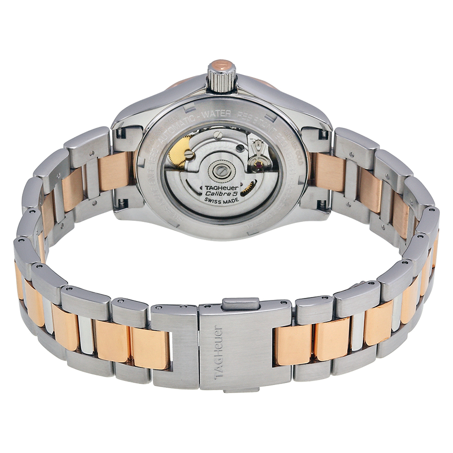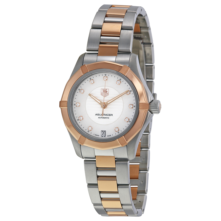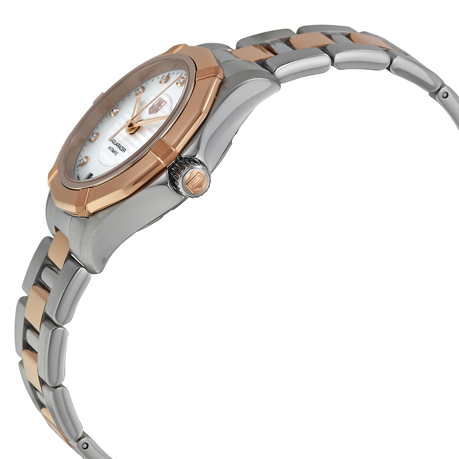 Stainless steel case with a stainless steel bracelet with 18kt rose gold links. Fixed 18kt rose gold bezel. Mother of pearl dial with rose gold hands and diamond hour markers. Minute markers around the outer rim. Dial Type: Analog. Date display at the 6 o'clock position. Quartz movement. Scratch resistant sapphire crystal. Screw down crown. Skeleton case back. Case diameter: 34 mm. Round case shape. Fold over clasp with push button safety release. Water resistant at 200 meters / 660 feet. Luxury watch style. Tag Heuer Aquaracer Mother of Pearl Dial Stainless Steel and 18kt Rose Gold Ladies Watch WAP2351BD0838.